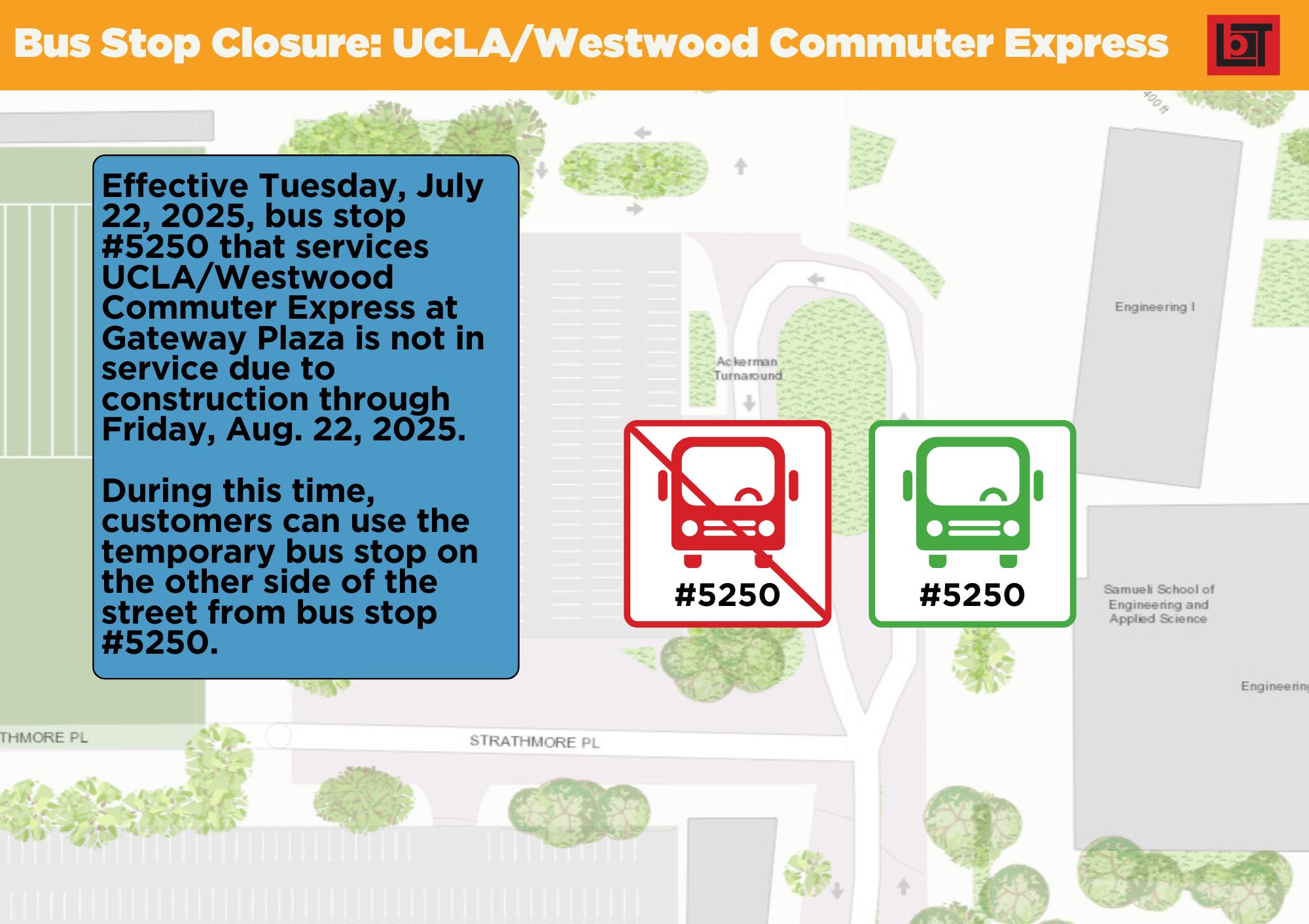Effective Tuesday, July 22, 2025, bus stop #5250 that services UCLA/Westwood Commuter Express at Gateway Plaza is not in service due to construction through Friday, Aug. 22, 2025.