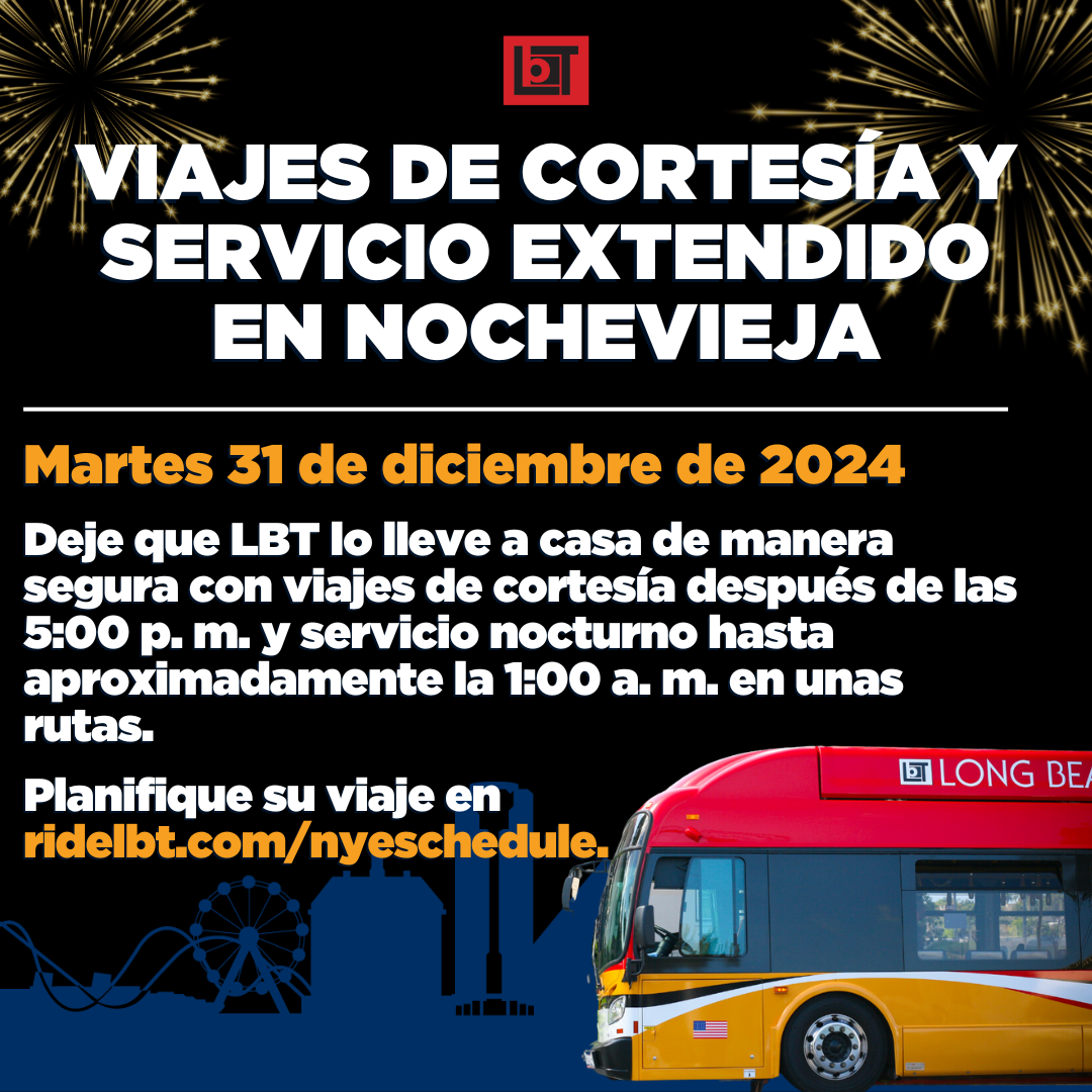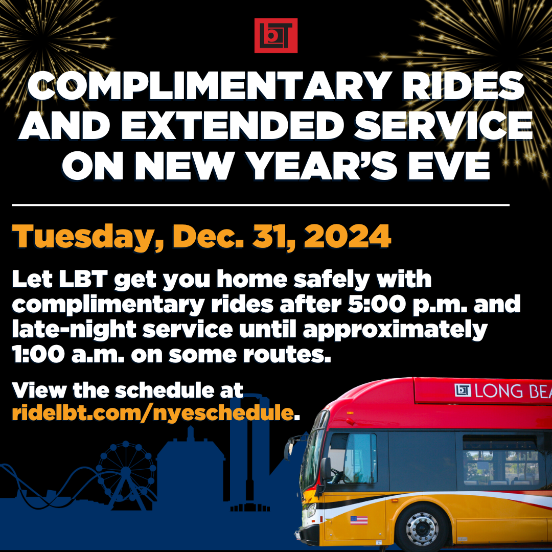 Long Beach, CA – Long Beach Transit (LBT) will provide complimentary bus service on all routes from 5:00 p.m. on Dec. 31, 2024, through approximately 1:00 a.m. on Jan. 1, 2025, to support safe New Year’s Eve celebrations.