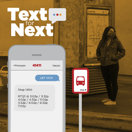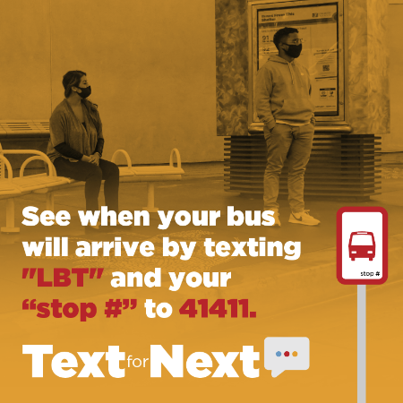 Just text āLBTā and your āstop #ā to 41411 to see when your bus will arrive.