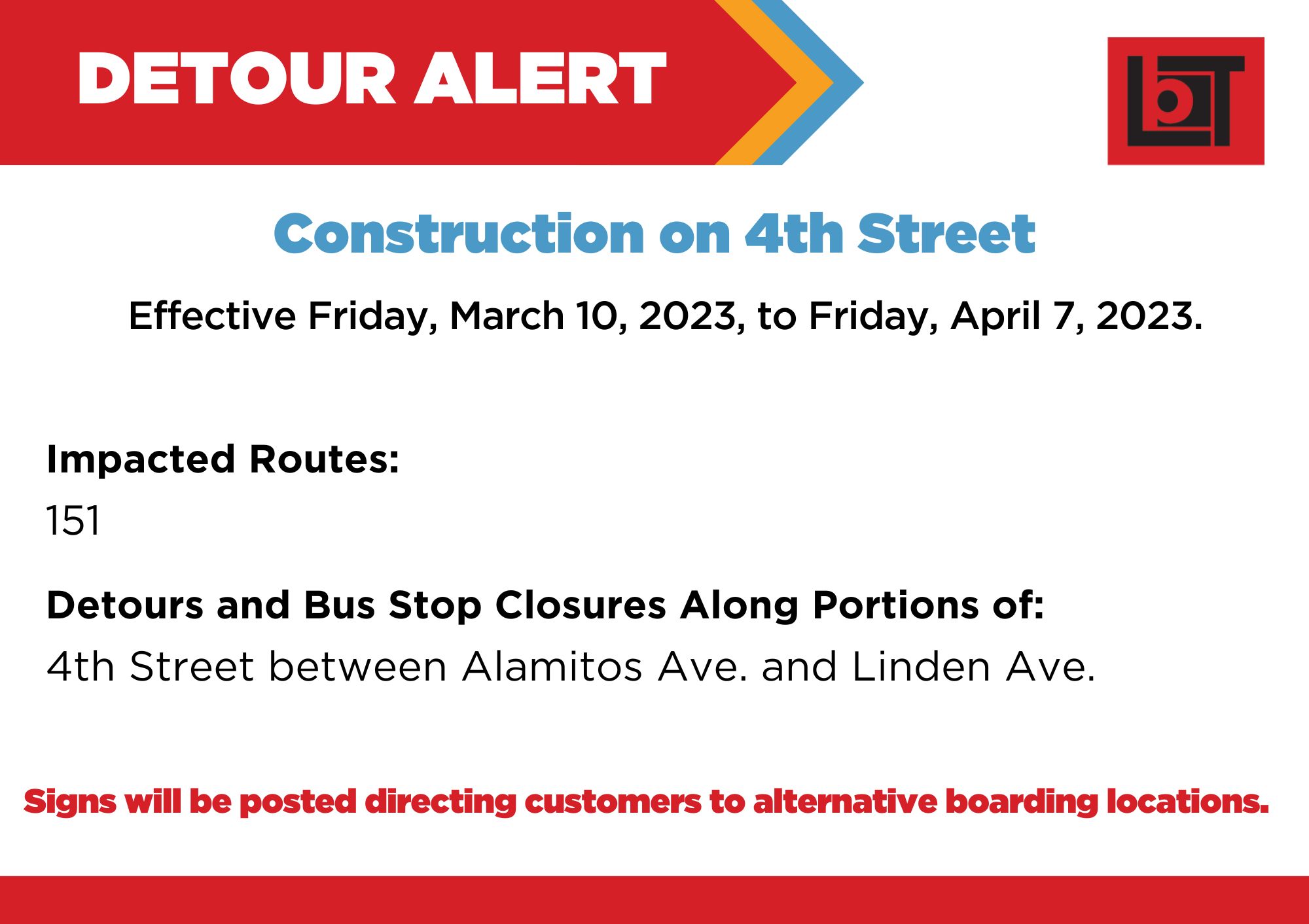 Due to construction on 4th Street, between Alamitos Avenue and Linden Avenue, there there will be a detour and bus stop closures from effective Friday, March 10, 2023, to Friday, April 7, 2023.Ā