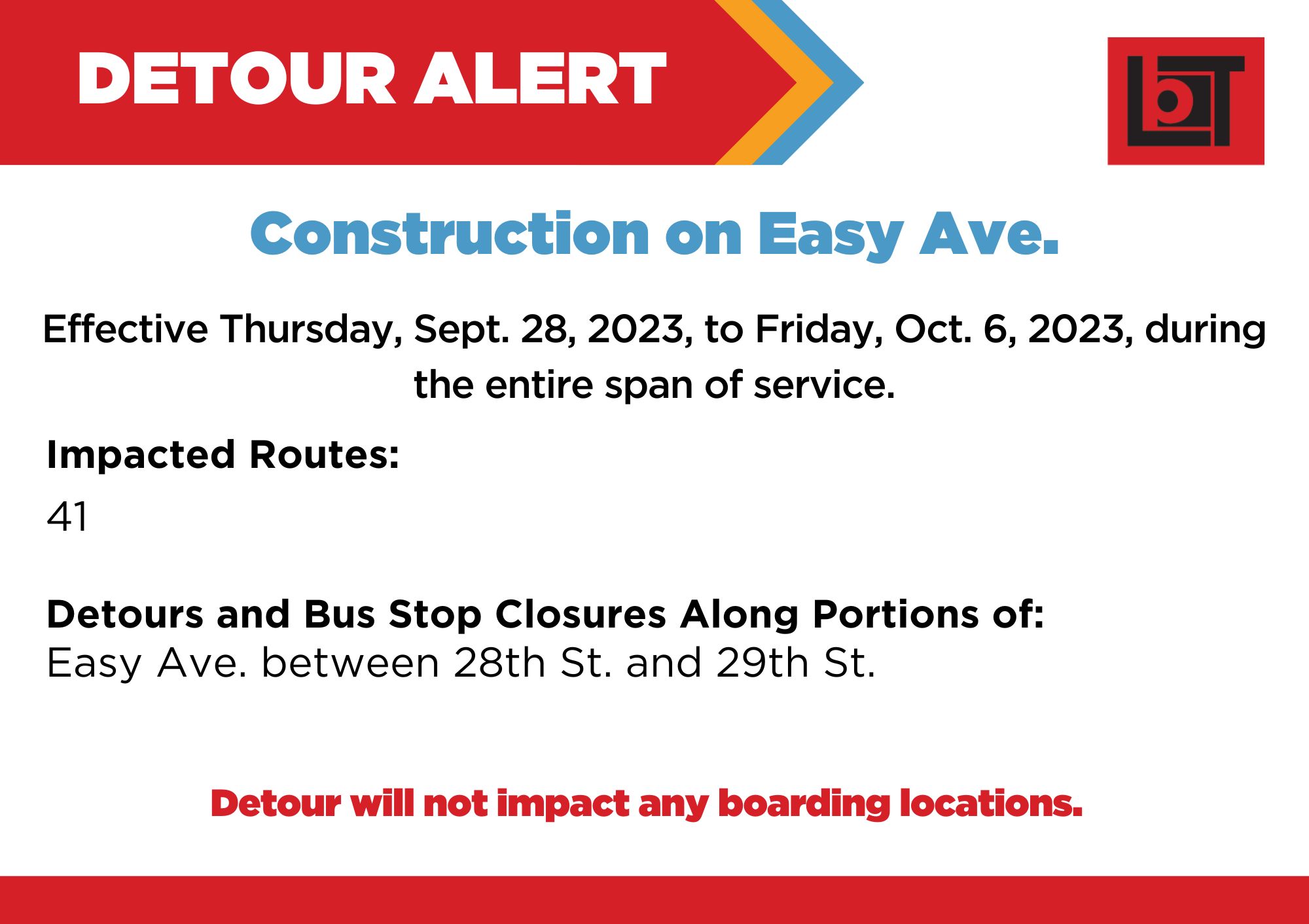 Due to construction on Easy Ave. from 28th St. to 29th St., there will be a detour on Route 41, effective Thursday, Sept. 28, 2023, to Friday, Oct. 6, 2023, during the entire span of service.