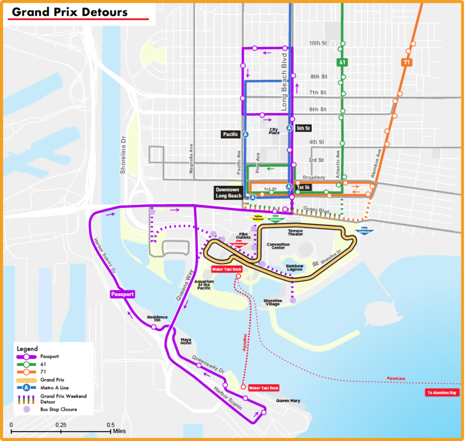 Due to the 2025 Acura Grand Prix of Long Beach, there will be a detour and bus stop closures on the Passport service and routes 61 and 71.
