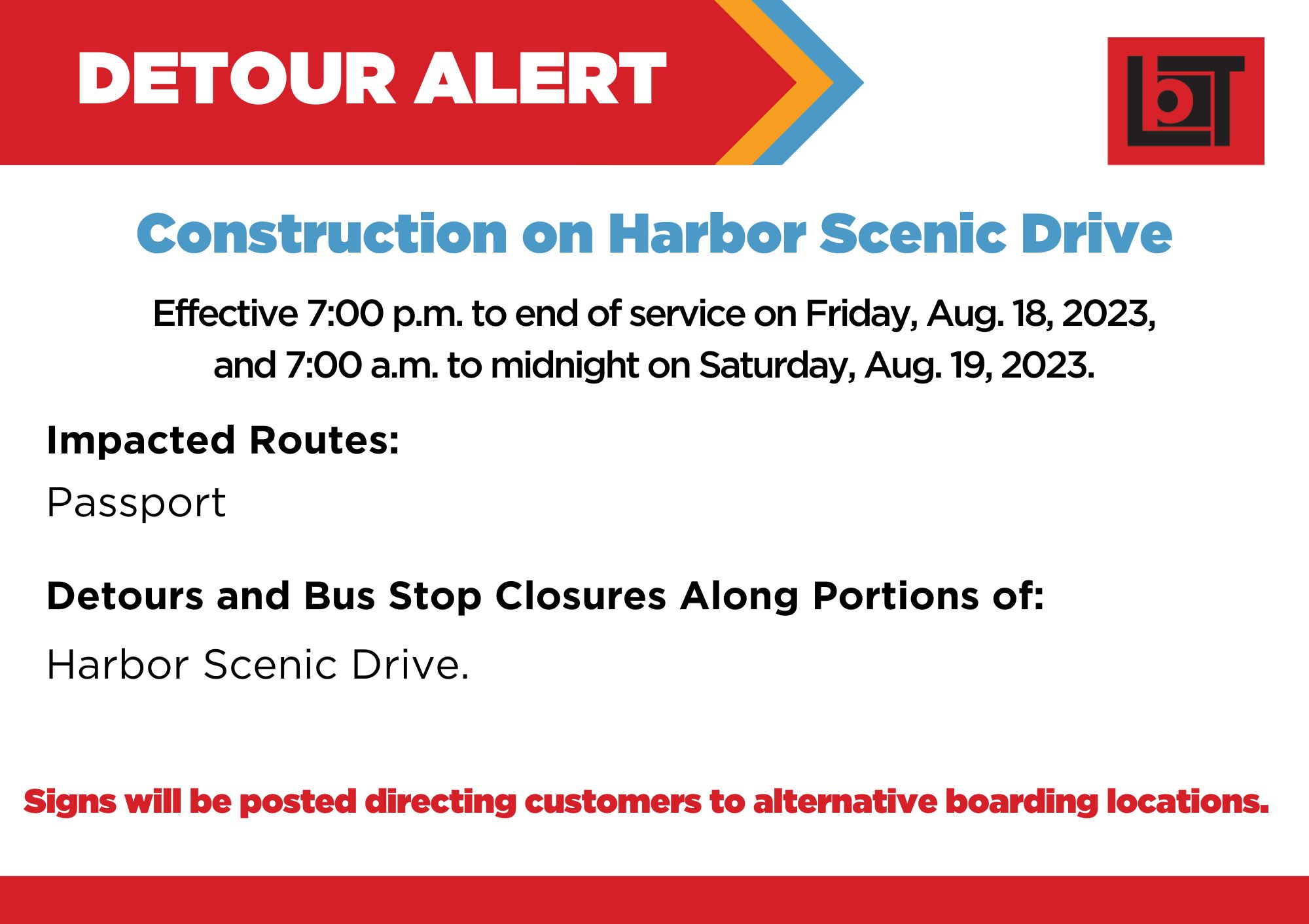 Due to construction on Harbor Scenic Drive, there will be a detour and bus stop closures on the Passport route effective 7:00 p.m. to end of service on Friday, Aug. 18, 2023, and 7:00 a.m. to midnight on Saturday, Aug. 19, 2023.
