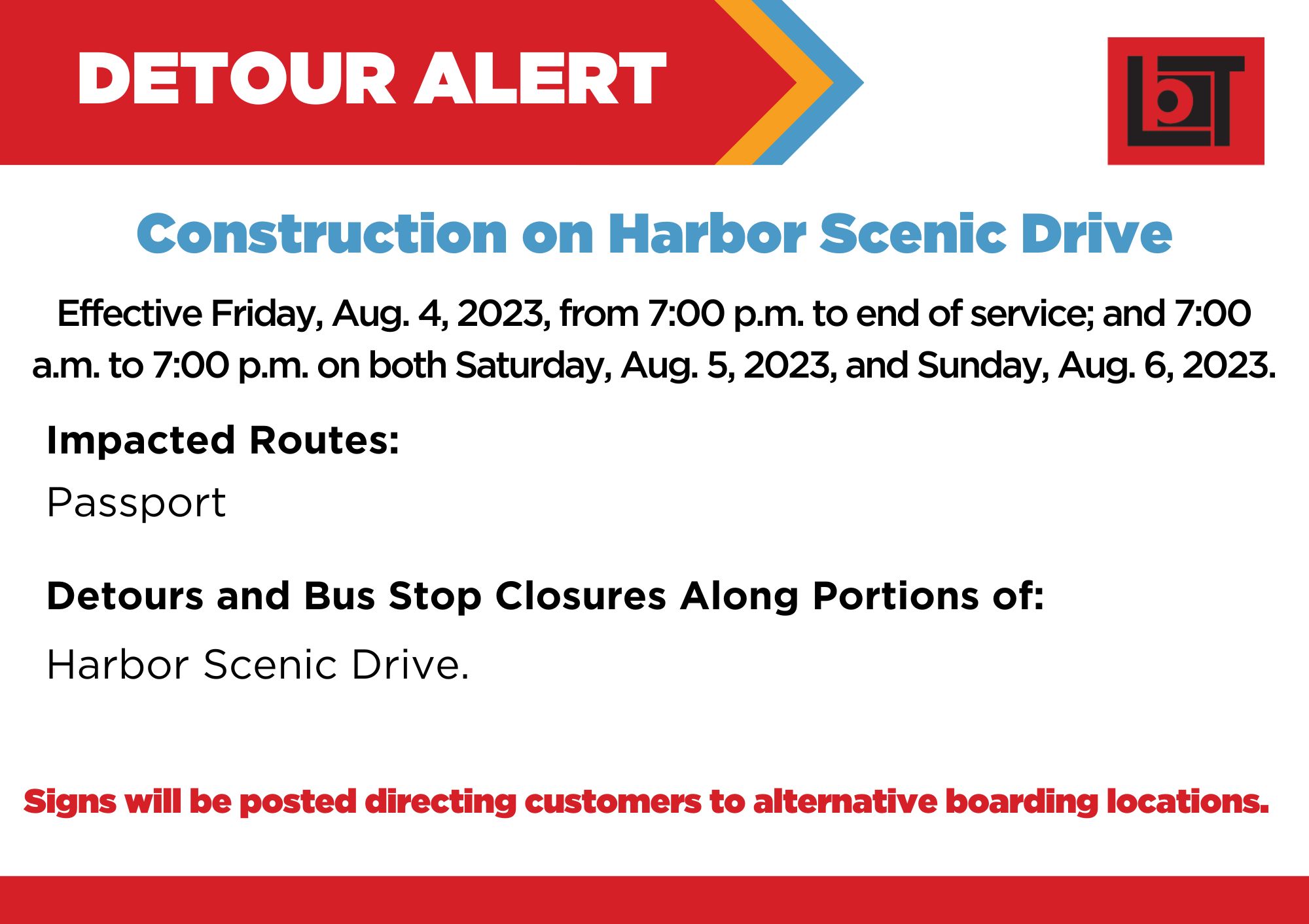 Due to construction on Harbor Scenic Drive, there will be a detour and bus stop closures on the Passport route on Friday, Aug. 4, 2023, from 7:00 p.m. to end of service; and 7:00 a.m. to 7:00 p.m. on both Saturday, Aug. 5, 2023, and Sunday, Aug. 6, 2023.