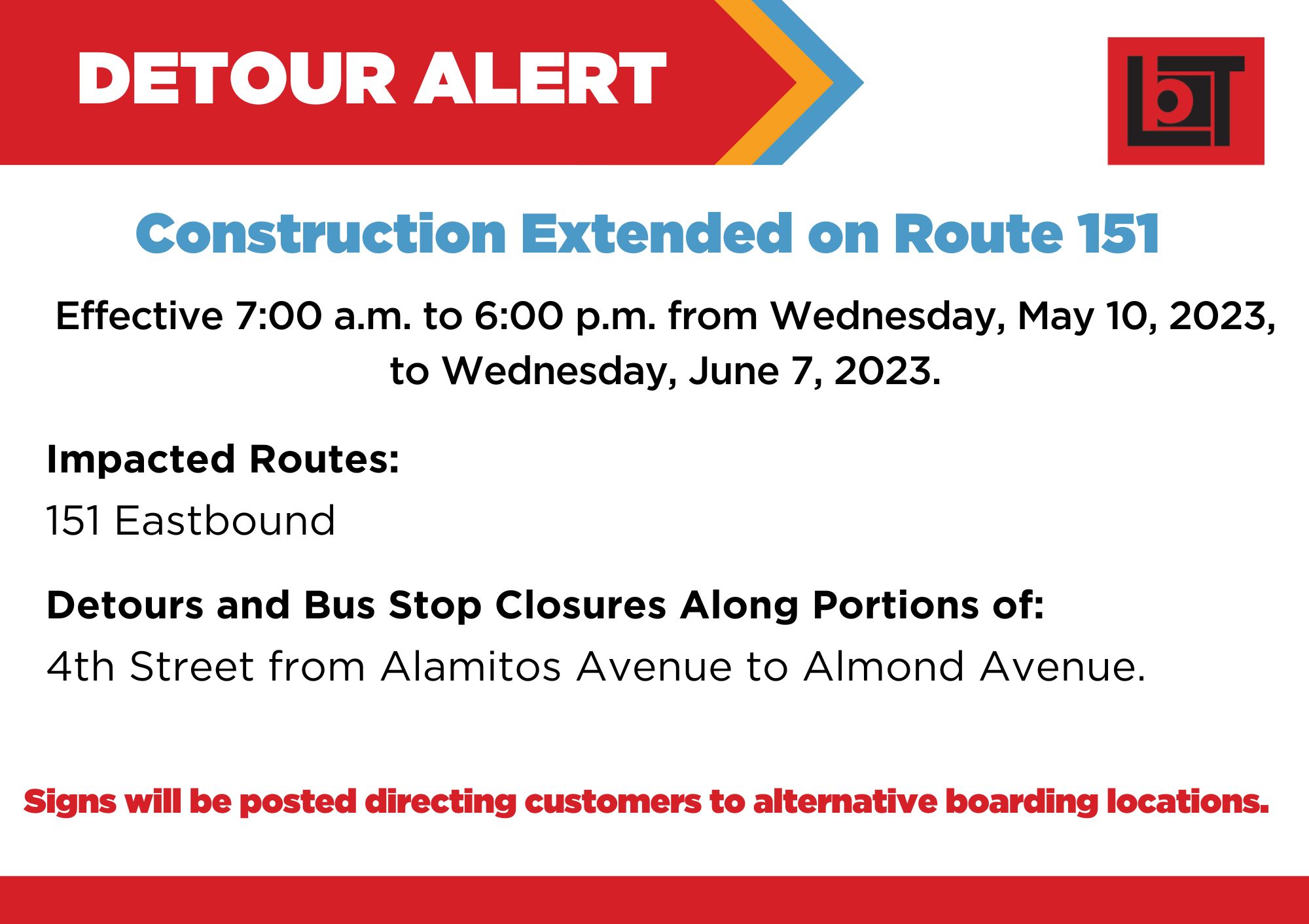 Due to construction on 4th Street from Alamitos Avenue to Almond Avenue, there will be a detour and bus stop closures during the entire span of service from 7:00 a.m. to 6:00 p.m. from Wednesday, May 10, 2023, to Wednesday, June 7, 2023.