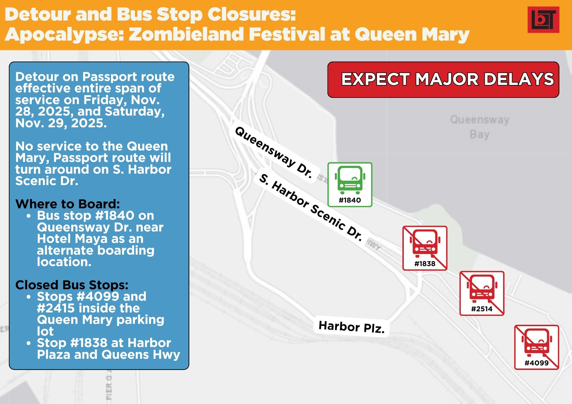 Detour and Bus Stop Closures: Apocalypse: Zombieland Festival at Queen Mary 11/28/25 - ridelbt.com Long Beach Transit