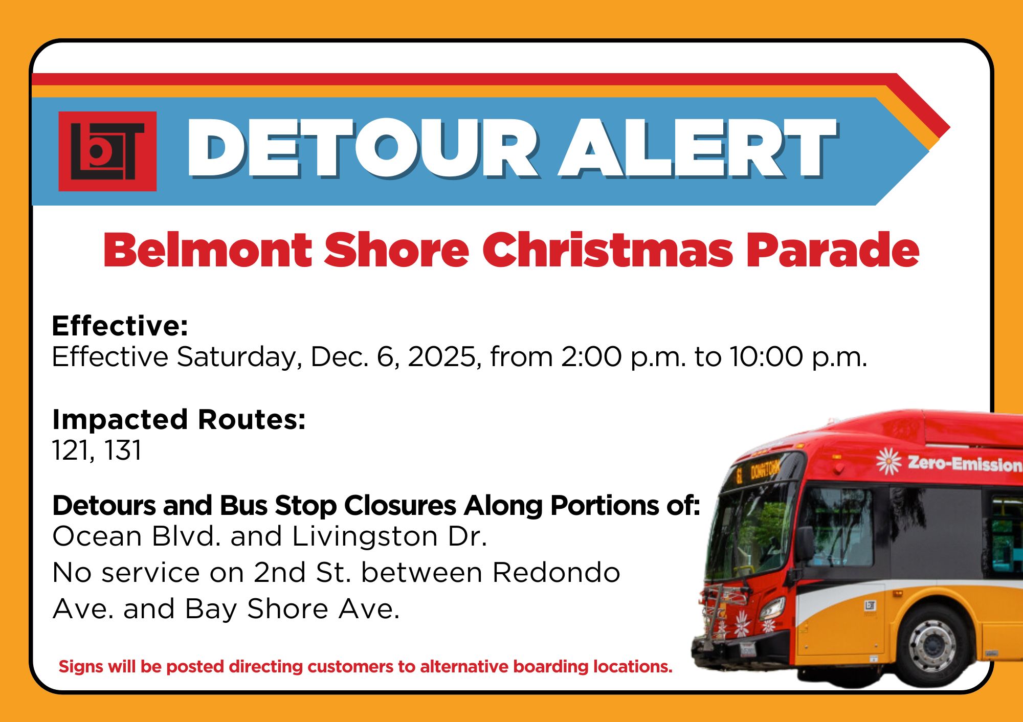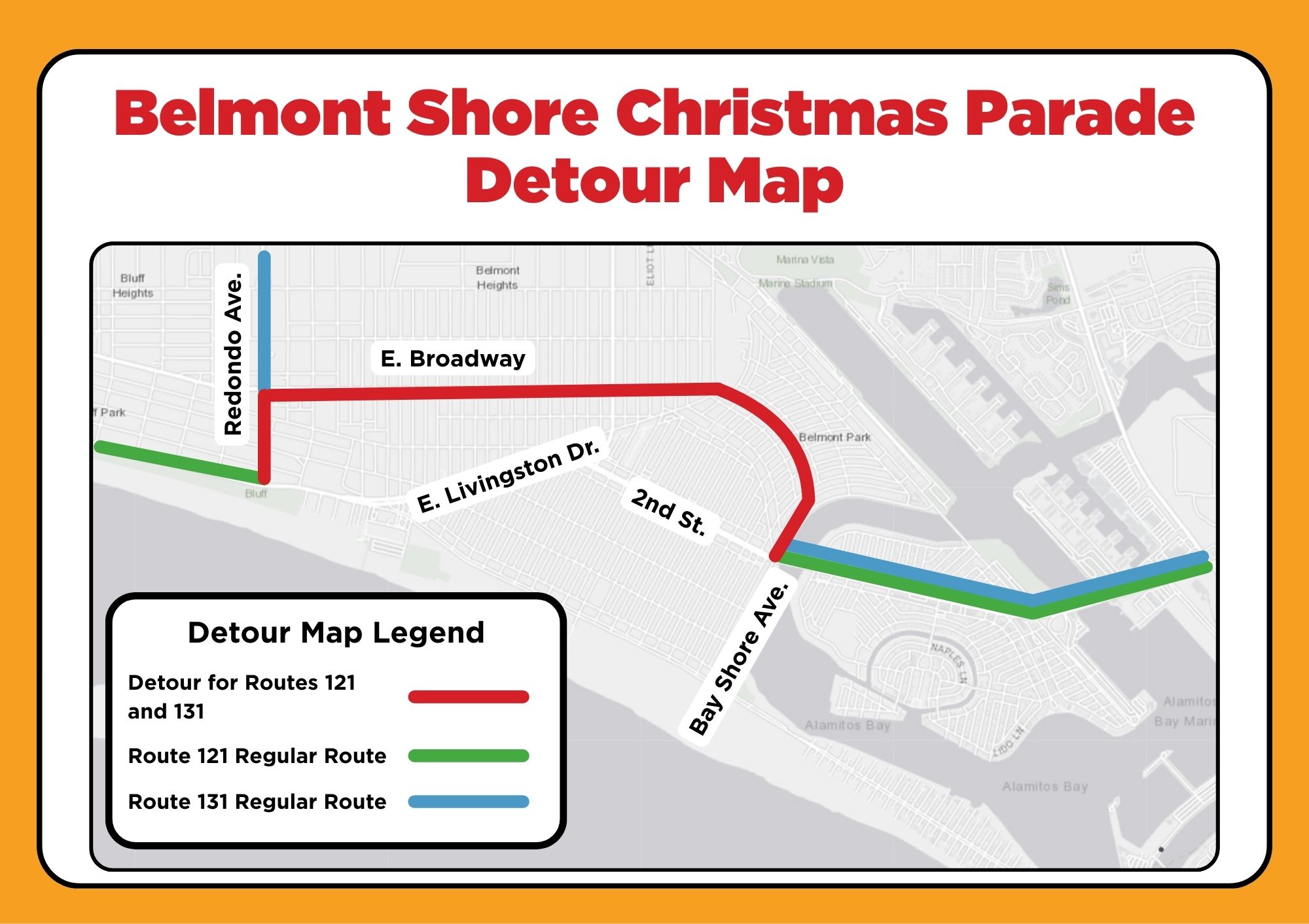 Due to the Belmont Shore Christmas Parade, there will be detour on Routes 121 and 131 effective Saturday, Dec. 6, 2025, from 2:00 p.m. to 10:00 p.m.
