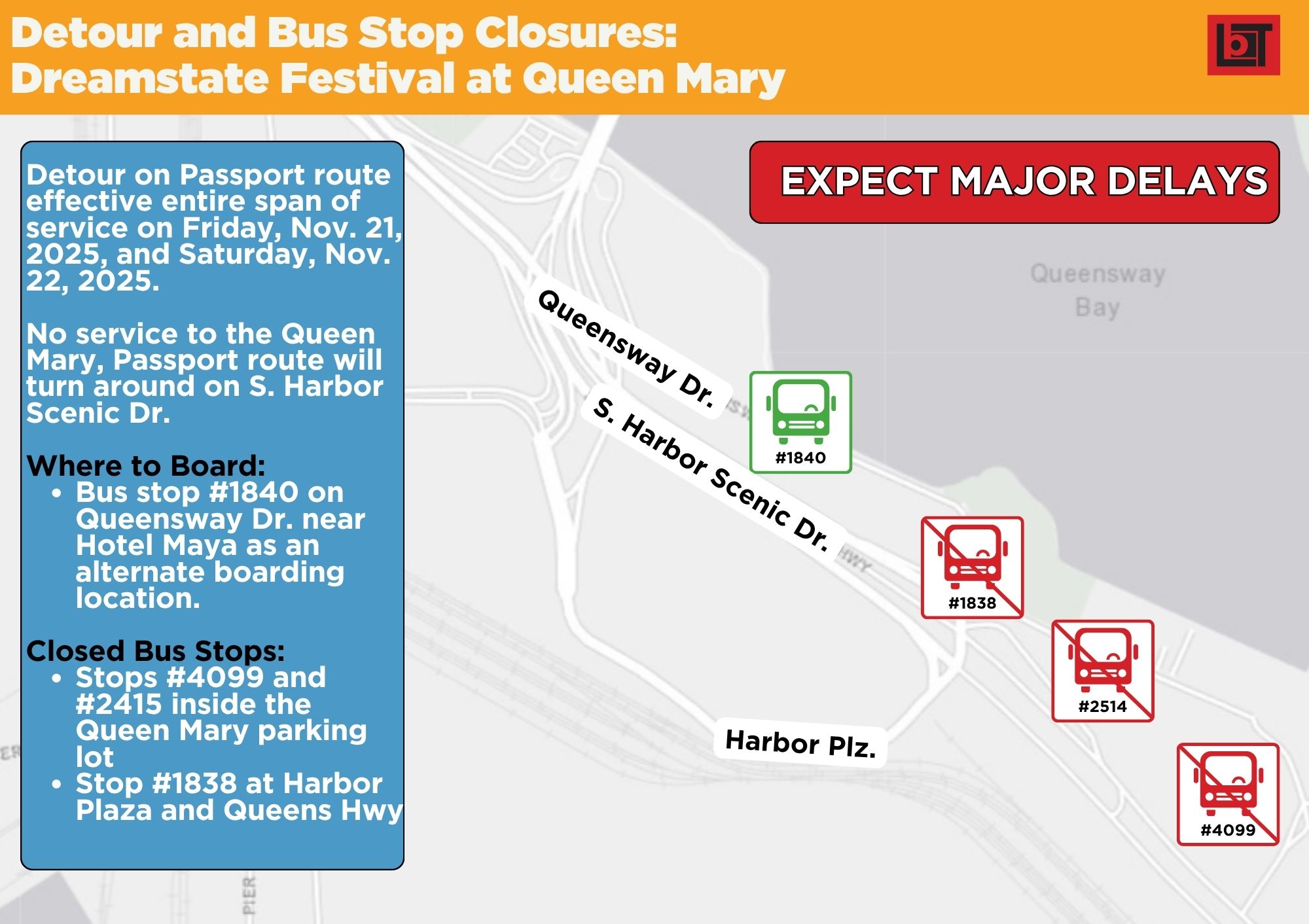 No service to the Queen Mary, Passport route will turn around on S. Harbor Scenic Dr.